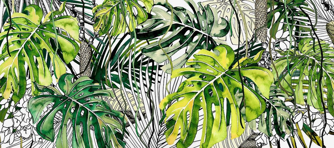 Pflanzengrün ist im Trend. Zimmerpflanzen erobern wieder Büro- und Wohnräume, stilisierte Monsterablätter sind ein beliebtes Sujet in der Mode und exotische Blätter sind ganz allgemein ein Wohn und Lifestyle Trend.