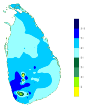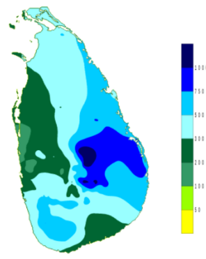 Die Verteilung der Niederschläge in diesem Zeitraum zeigt, dass der gesamte südwestliche Sektor im Hügelland 250mm Niederschlag erhält, wobei die Region an den südwestlichen Hängen Niederschläge von über 700mm aufweisen. Über die meisten Teile der Insel variiert die Niederschlagsmenge zwischen 100 und 250 mm, wobei die nördliche Jaffna-Halbinsel (Jaffna- 78mm, Elefantenpass 83mm) eine bemerkenswerte Ausnahme bildet.