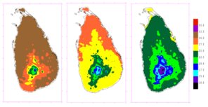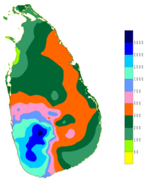 Die Niederschläge aus diesen Maximalregionen nehmen in Richtung der höheren Höhe ab, und in Nuwara-eliya fällt sie auf 850mm. Die Schwankungen in Richtung des südwestlichen Küstenbereichs sind weniger stark, da der südwestliche Küstenstreifen in diesem Zeitraum zwischen 1000mm und 1600mm Regen verzeichnete.